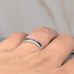 This beautiful ring band is delicate and minimalistic. It is made of 925 Sterling Silver and features the Ring symbol very subtly engraved with laser and surrounded on both edges with small clear cubic zirconia stones. The band is confortable and therefore easy to wear every day. Can also be considered to wear as a wedding band.