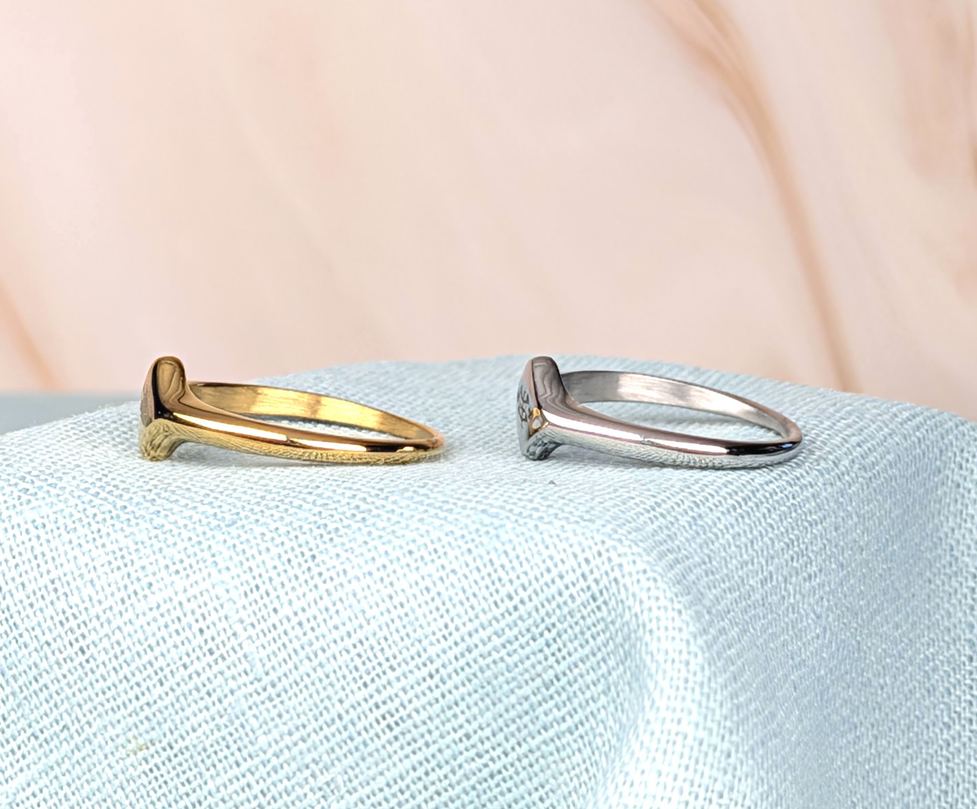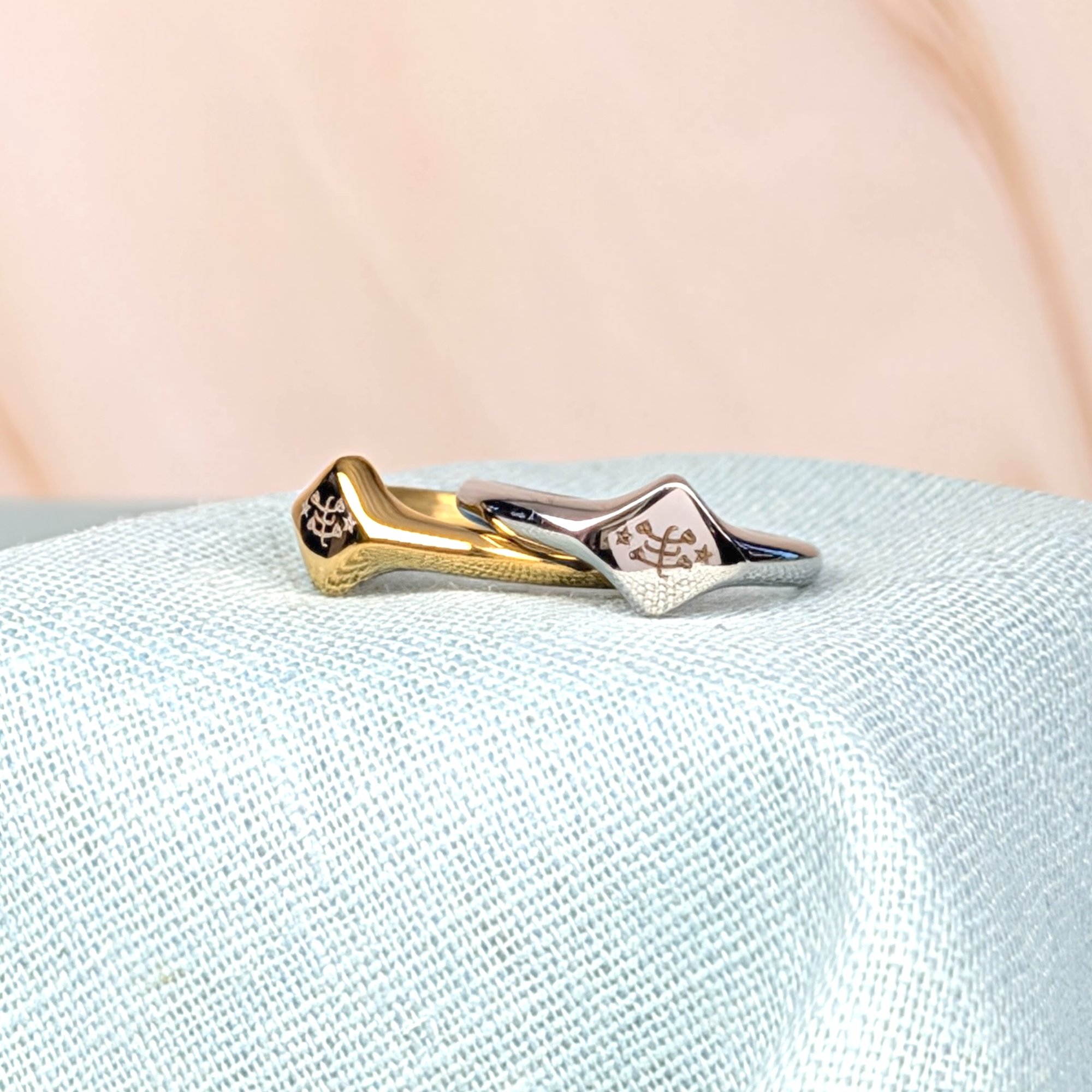 Beautifully crafted, a classic ring with a modern twist. Elegant and minimalistic, this ring is made of stainless steel, with the Ringstone Symbol engraved on it with laser. Available in silver color and yellow gold plating.